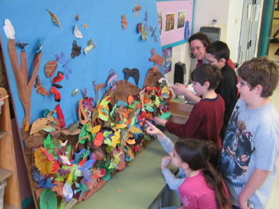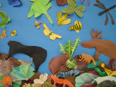 A school in Vermont asked me to adapt my Log's Life Mural Project to support their anti-bullying theme. We decided that the close proximity of predators and prey could express this idea. After this succesful program I decided to include a Peaceable Kingdom in my workshop listings.