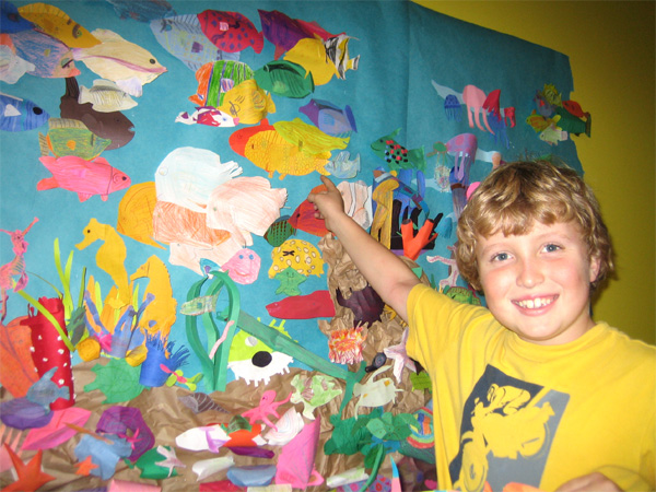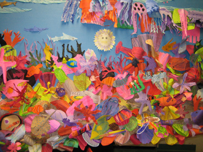 "Today was one of those kinds of days that remind me how much I like working in a school. My office is in the library and I could hear the laughter from the audio visual room where children's book illustrator and artist Robin Brickman was giving a PowerPoint presentation to the kindergartners about making a sea-life, three dimensional mural. Another librarian said I should sit in on one of her working sessions as she was giving all the students, K-5, the experience of making 3-dimensional art for inclusion in a mural." F.P., Chadwick Village School, CA